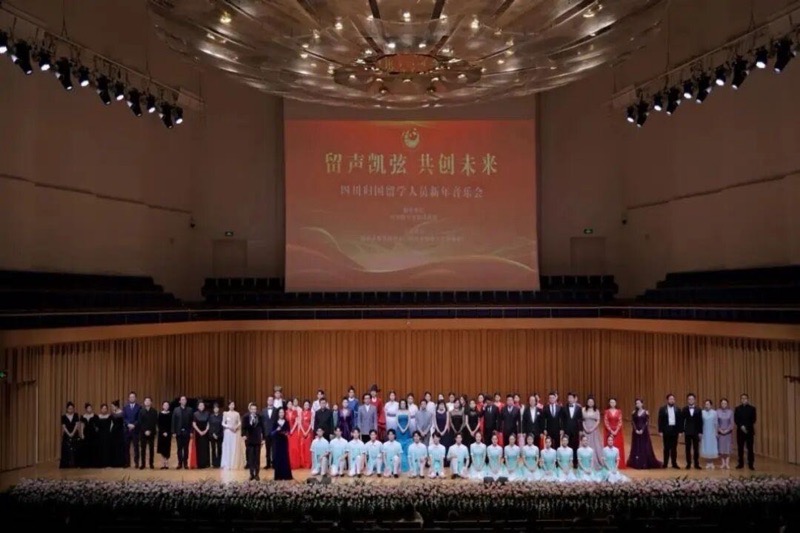 12月19日,四川归国留学人员新年音乐会在成都城市音乐厅隆重举行。作为省委统战部指导、省欧美同学会主办的品牌活动,本次音乐会以“归蜀・乡音”“同行・四海”“筑梦・未来”三个篇章为主线,通过民乐、朗诵、声乐等多种艺术形式,深情展现归国学子的家国情怀与奋斗风貌。四川省政协原副主席、省欧美同学会会长王正荣出席并致辞,四川省委统战部常务副部长余先河、四川音乐学院党委书记杜伟出席音乐会。王正荣在致辞中强调,广大留学人员要充分发挥“人才库、智囊团、生力军”作用,将个人所长与国家所需紧密结合。活动凝聚了千余名归国留学人员代表,进一步激发了他们的创新活力与报国热情。