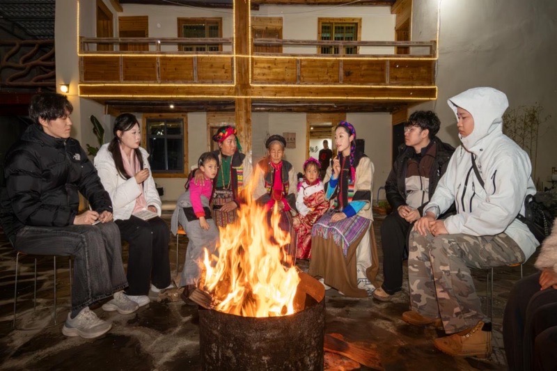 制茶工坊里,从蒸青、揉捻到压制茶饼,学生们完整体验了绒巴茶制作全流程。木槌敲击模具的“咚咚”声在工坊里回荡,播音与主持艺术专业的同学对着镜头做现场报道,广播电视编导专业和影视摄影与制作专业的同学则用第一视角记录下每一项工序。三代传承人首次同框,与学生们围坐篝火旁,讲述六十年坚守与创新的故事。手背上的裂纹与老茧,见证了这项非遗的代代相传。