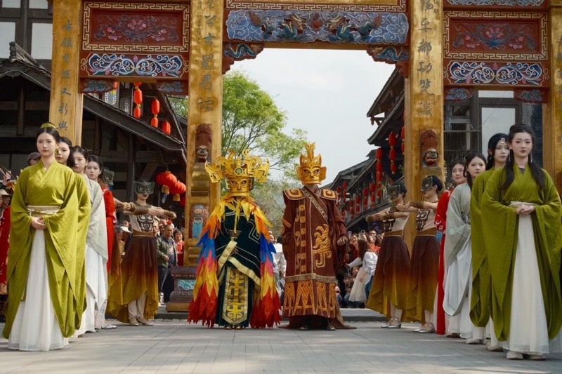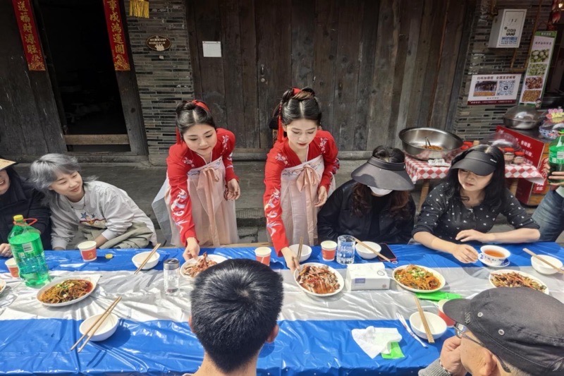 活动当天,传媒学院办公室主任张旭老师带领学院党委“川小音”党员志愿服务队20余名学生志愿者深入古镇一线,紧密配合彭州市若水社会工作服务中心的现场组织,围绕蜀道山文化推广、游客引导讲解、秩序维护等开展服务。志愿者们结合传媒专业特长,在蜀王宴文化体验环节中,以生动的讲解和贴心的陪伴,帮助市民游客深度感知蜀地传统文化的独特韵味,展现出川音学子良好的专业素养与精神风貌。