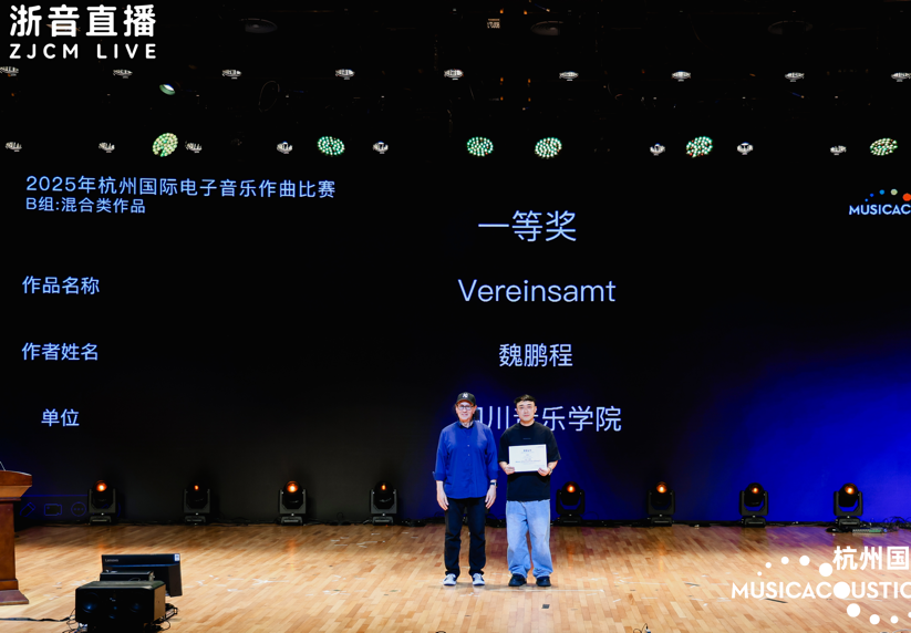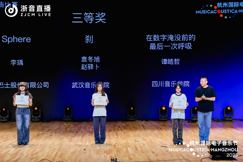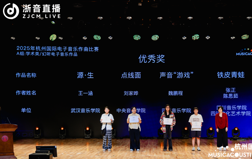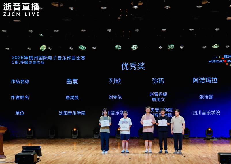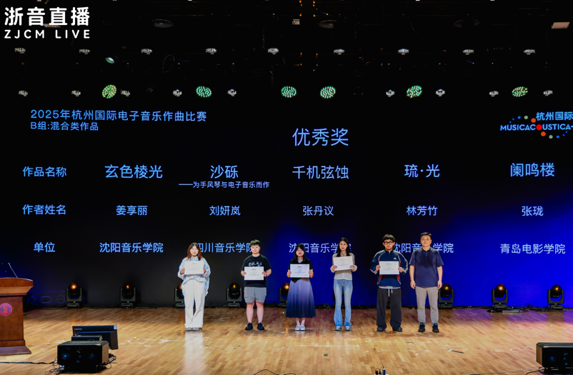 四川音乐学院音乐工程系副主任陆敏捷、电子音乐作曲教研室负责人梁奕飞、电子音乐实训教研室负责人杨光、青年教师赵天、李思洁、杨玉倩,以及13名研究生本科生,应邀赴2025杭州国际电子音乐节参与学术交流和各项活动。在2025杭州国际电子音乐作曲比赛决赛环节,川音音乐工程系学生最终获得一等奖1项、二等奖1项、三等奖1项,优秀奖5项,具体如下: