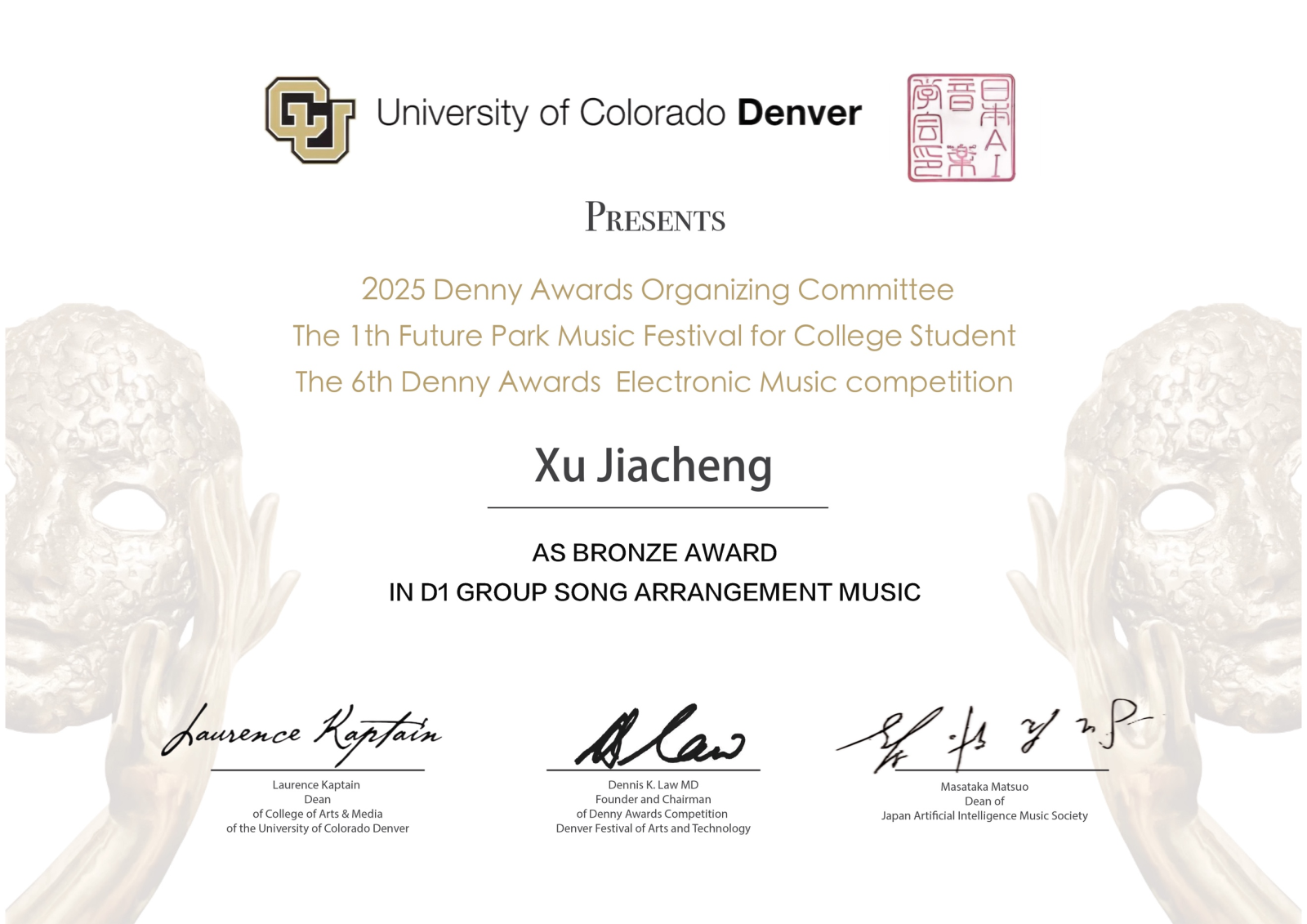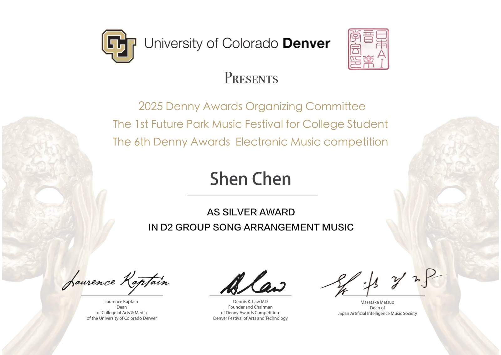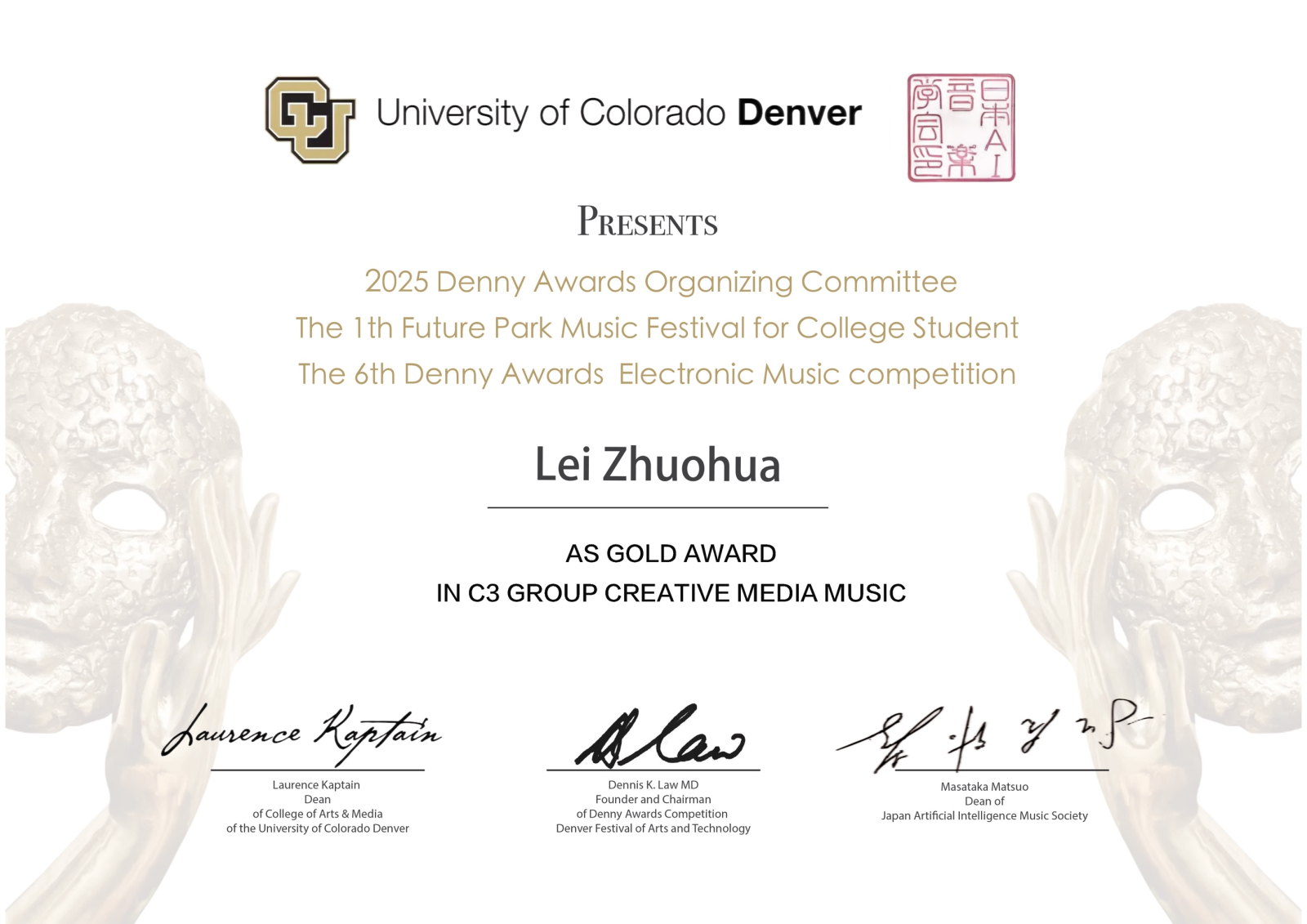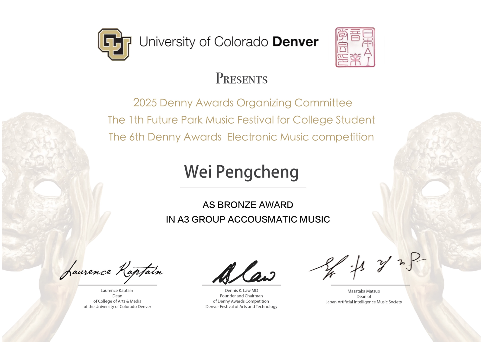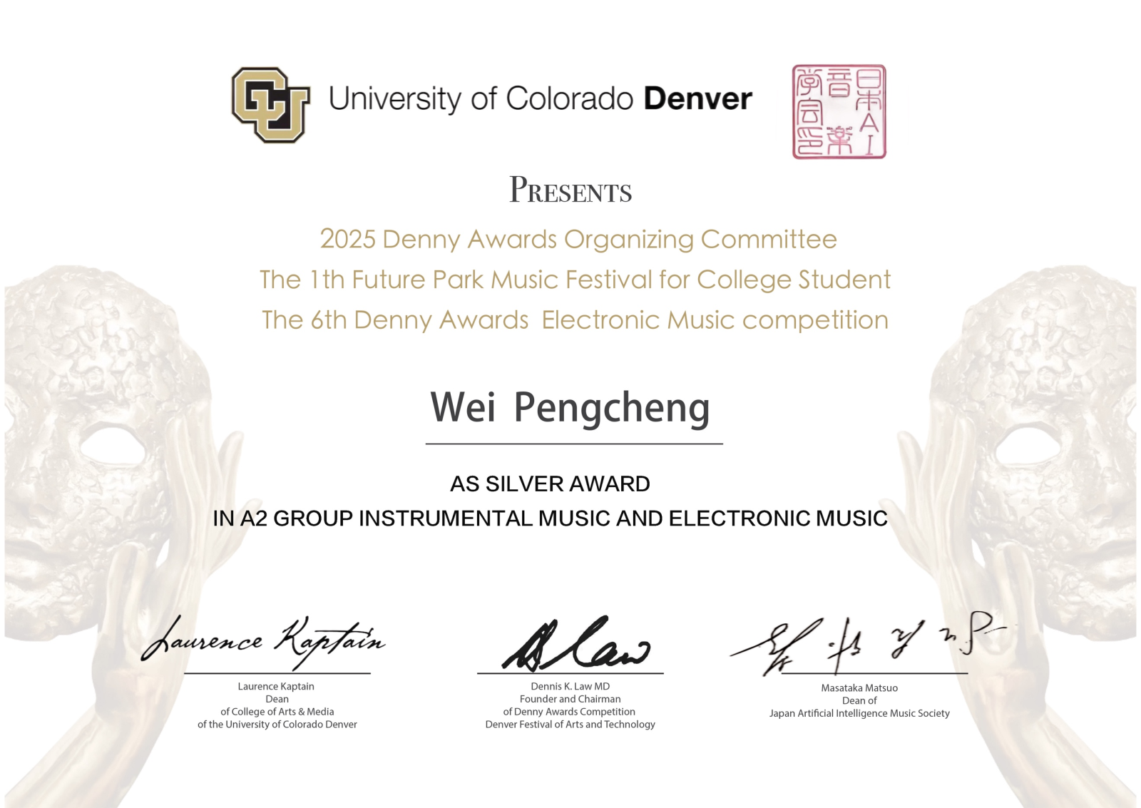 2025年9月9日,第六届丹尼奖国际电子音乐比赛(Denny Awards)公布了所有组别的决赛获奖结果。四川音乐学院音乐工程系共有7部师生作品在丹尼奖【主竞赛单元】的5个组别获得奖项,分别如下: