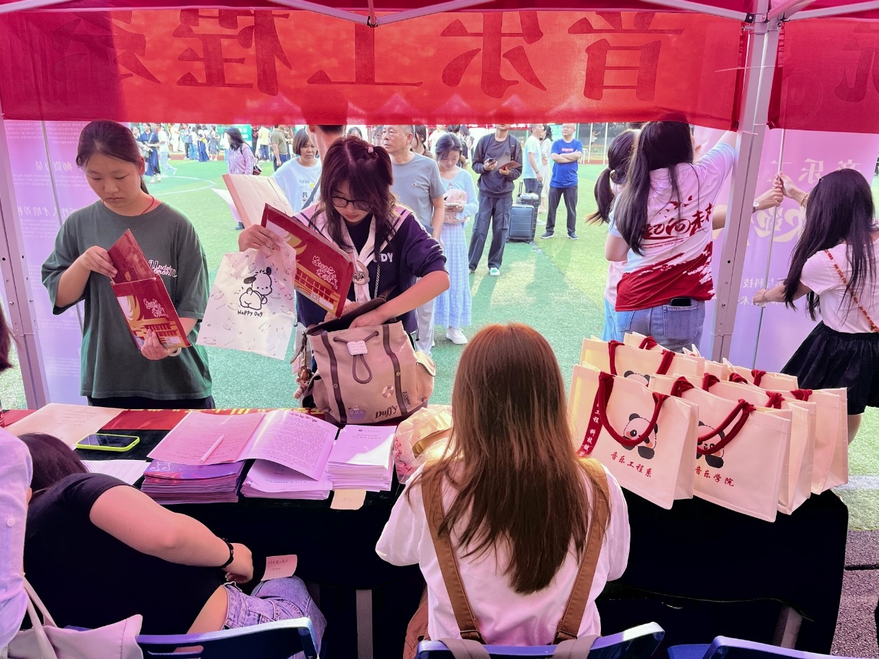 为让新生顺利开启校园生活,音乐工程系的领导、老师们提前筹备,细化入学流程、整理报到资料,在报到现场为新生及家长答疑解惑;学生志愿者穿梭于校园各处,主动帮忙搬运行李、引导办理入学手续,用耐心与贴心传递着对“小萌新”的关怀,让新生快速适应新环境。系主任徐静平为新生精心准备了伴手礼手袋,这份贴心礼物不仅为新生带来初秋的清凉,更寄托着院系对同学们认真治学、学有所成的殷切期望。