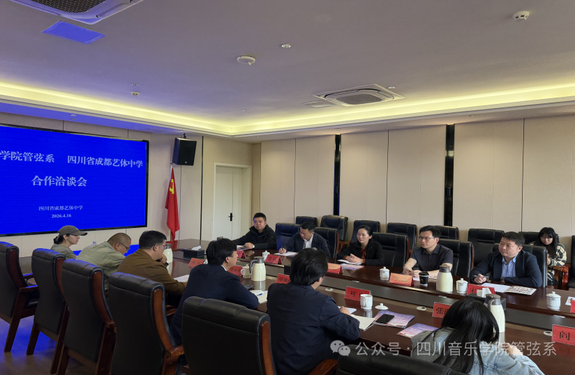 2026年4月16日,管弦系领导班子全体成员赴成都市艺体中学开展校际合作交流洽谈活动,成都市艺体中学党委书记、副校长及教研室相关负责人全程参与,双方展开深度沟通交流。