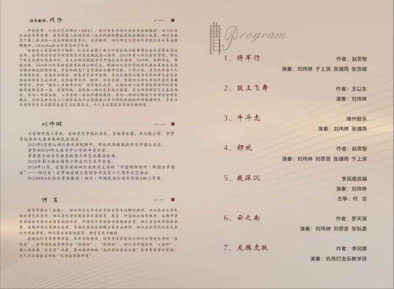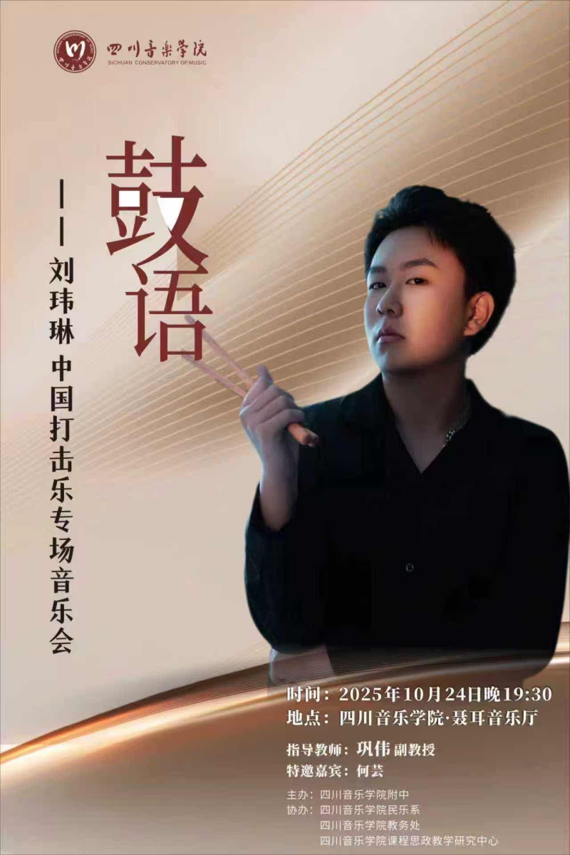 民乐系附中高三年级中国打击乐专业刘玮琳独奏音乐会将于2025年10月24日晚7点30分在四川音乐学院聂耳音乐厅举行。