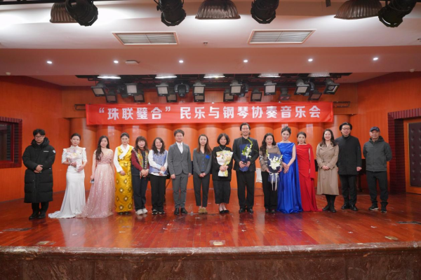 随着终曲《江河云梦》的旋律缓缓落下,“珠联璧合”民乐与钢琴协奏音乐会在热烈掌声中圆满落幕。民乐系领导、指导教师及全体演奏者共同上台合影留念,为这场融合传统与现代的艺术盛会画上了圆满的句号。