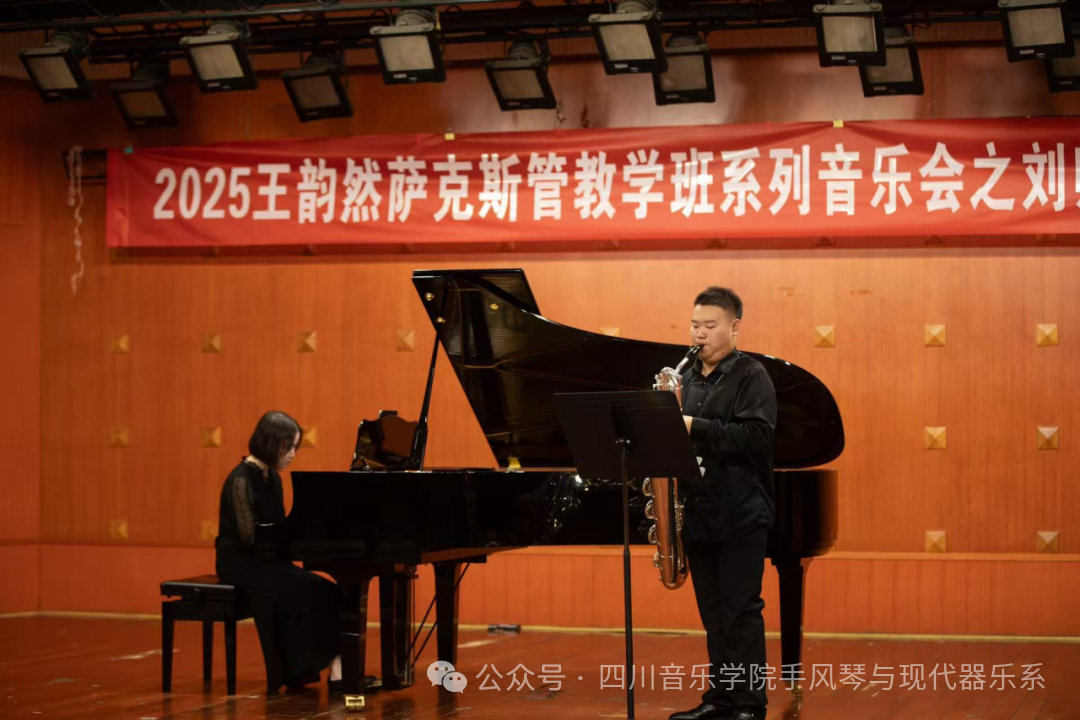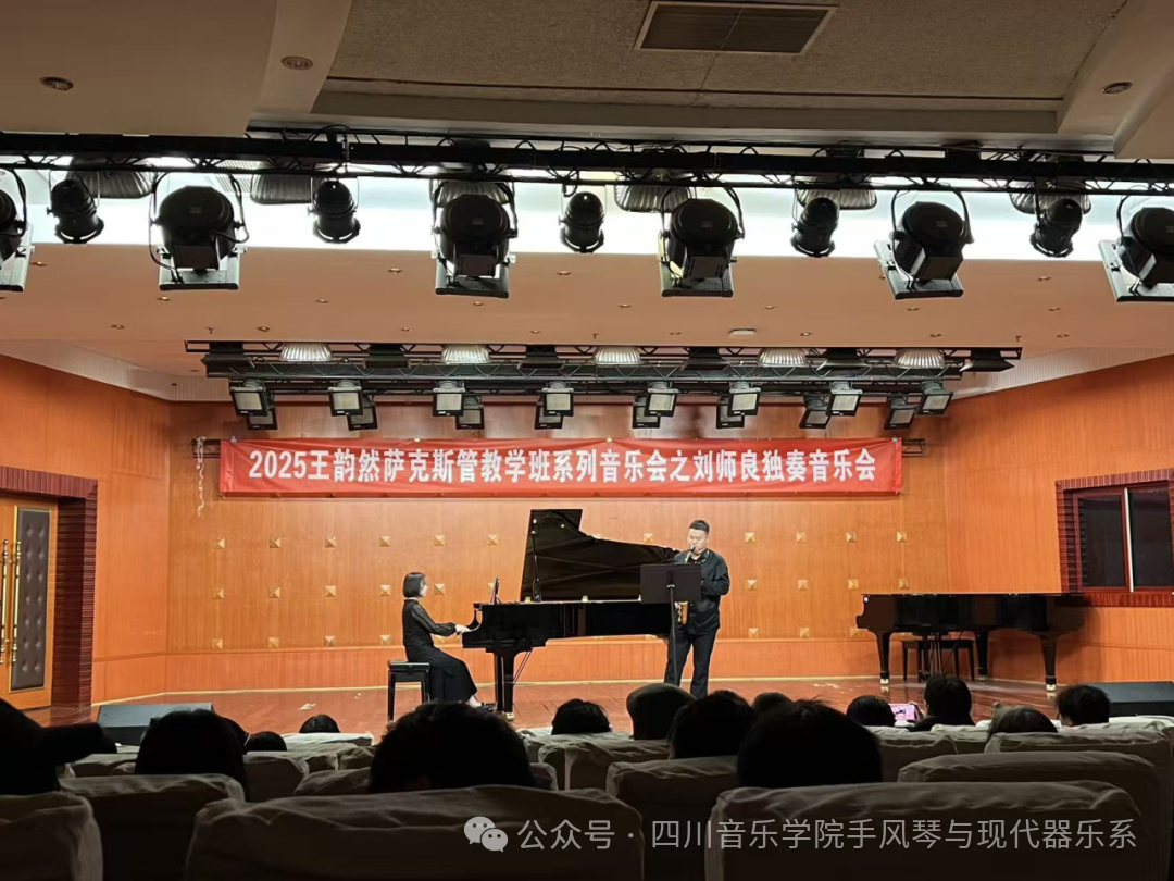 2025年10月31日晚7:30,《王韵然萨克斯管教学班系列音乐会之刘师良独奏音乐会》在四川音乐学院星海音乐厅成功举办。 本次音乐会有中音萨克斯管与钢琴和上低音萨克斯管与钢琴两种演奏形式。 音乐会以国际大赛常用作品雅克·伊贝尔的《室内小协奏曲》开场。随后,刘师良带来了保罗·克里斯顿的《协奏曲作品26号》、保罗·哈维的《奏鸣曲》以及王光敏的《水晶草》,几首风格各异的曲目被刘师良演绎得精彩纷呈。刘师良在舞台上稳定的发挥以及良好的台风展现了王韵然老师的教学水平,音乐会在观众们热烈的掌声中圆满落下帷幕。