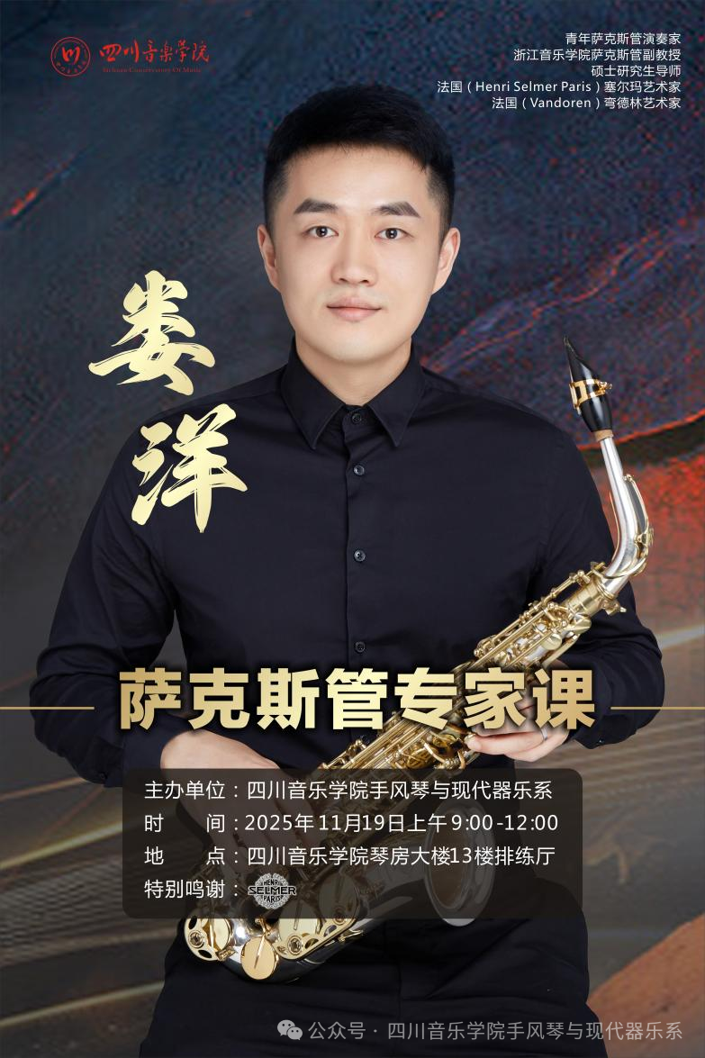 为加强与浙江音乐学院萨克斯管专业的交流合作,我系邀请浙江音乐学院萨克斯管副教授、硕士研究生导师娄洋于2025年11月19日上午9:00-12:00,在四川音乐学院琴房大楼13楼排练厅举办专家课。本次专家课由我系副系主任梅松副教授主持,我系青年教师蒋依辰与管弦系青年教师朱菡芊博士担任钢琴艺术指导,我系、音乐教育学院、音乐工程系萨克斯管专业师生参加观摩学习。