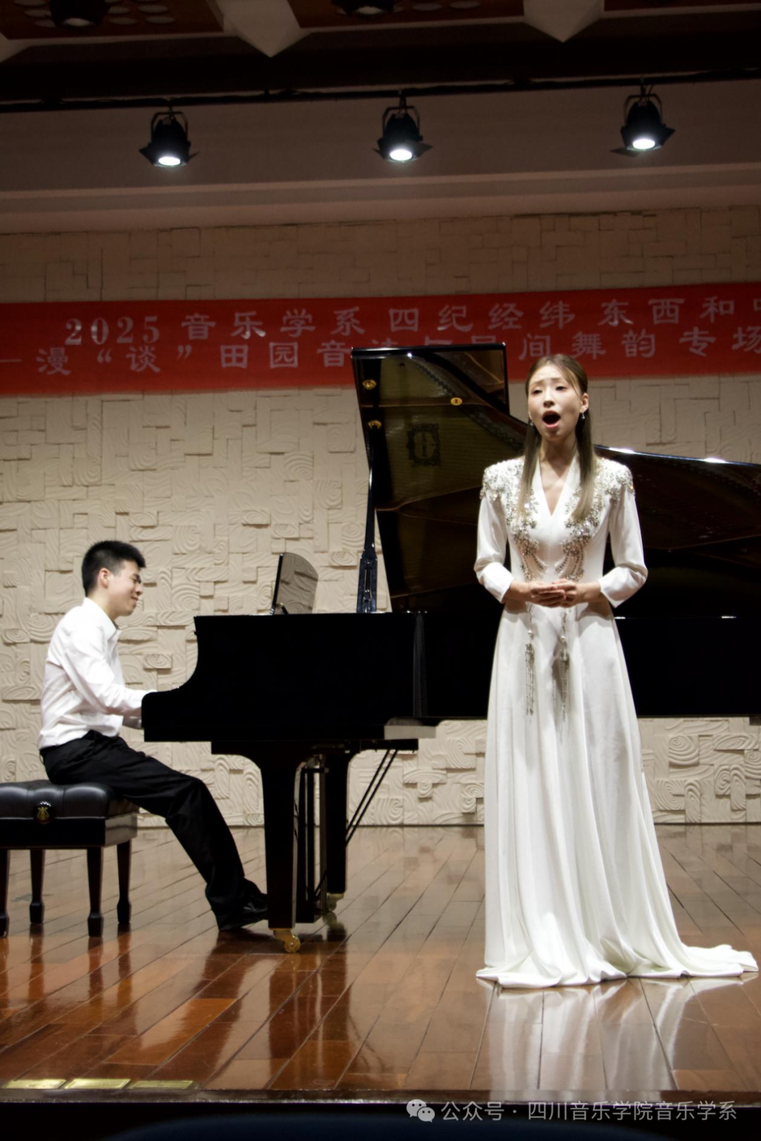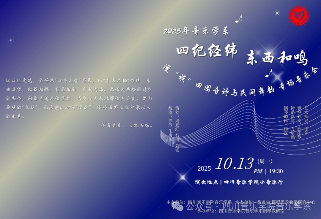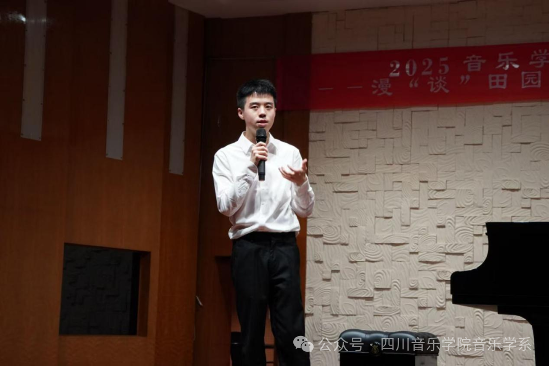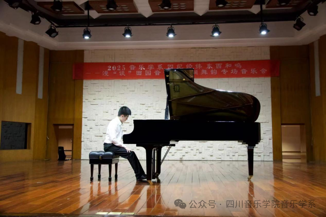 2025年10月13日19时30分,四川音乐学院音乐学系钢琴教研室在小音乐厅成功举办“四纪经纬 东西和鸣——漫‘谈’田园音诗与民间舞韵”钢琴专场音乐会。本场音乐会由钢琴教研室徐芳副教授与朱贞贞副教授统筹组织,选定2022级音乐学系学生欧阳枢以“钢琴独奏+学术导赏”的创新形式呈现,并特邀2024级音乐学系方星懿同学登台献唱。音乐学系党委书记周夏虹、副系主任刘雯、副书记兼纪委书记芶用莅临音乐会现场,此外,音乐学系的大部分师生也全程参与了音乐会的观摩。